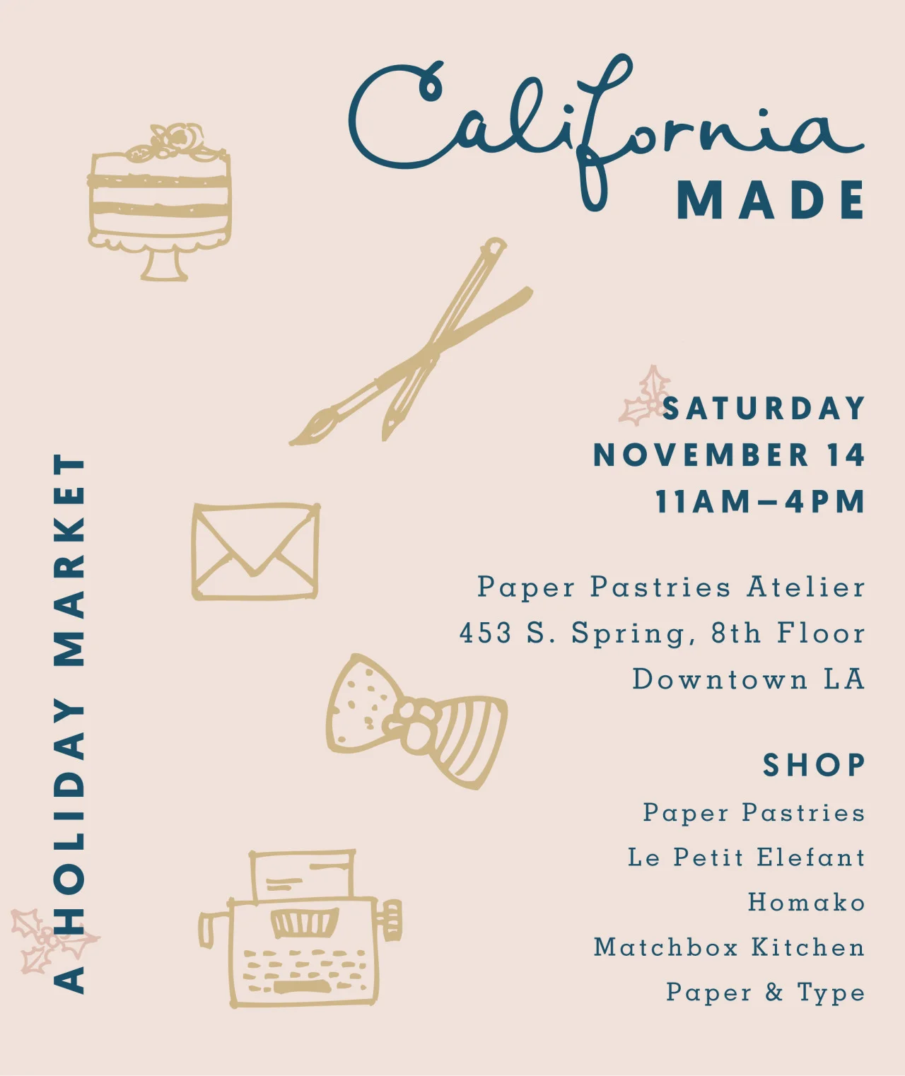 Next Saturday, November 14, I will be participating in California Made: a holiday market in Downtown LA. I'll have cake by the slice available and a couple other surprises!