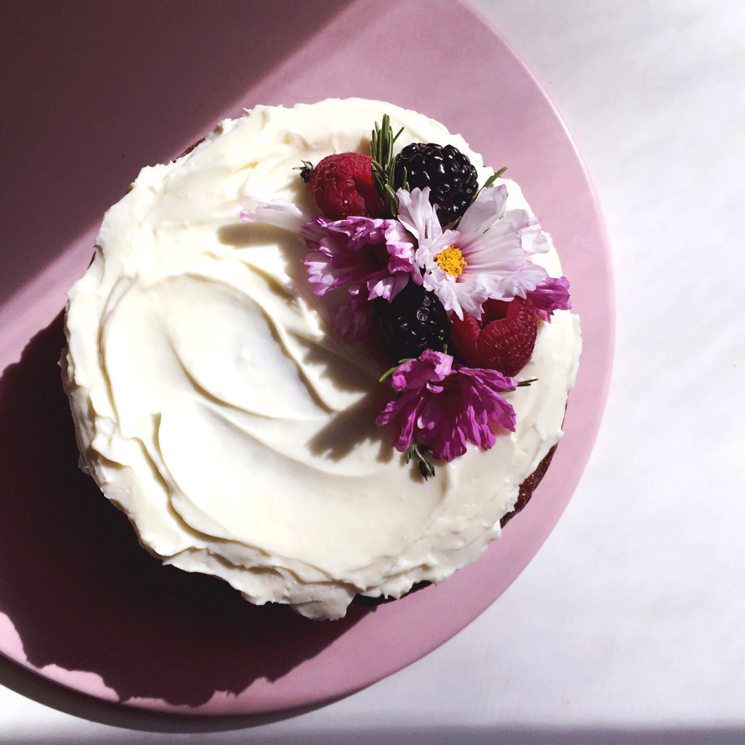- Pour batter into prepared pan and bake until a skewer inserted in the center comes out clean, about 40 minutes. Let cool for 5 minutes before inverting onto a cooling rack. Enjoy warm or let cool completely if frosting.