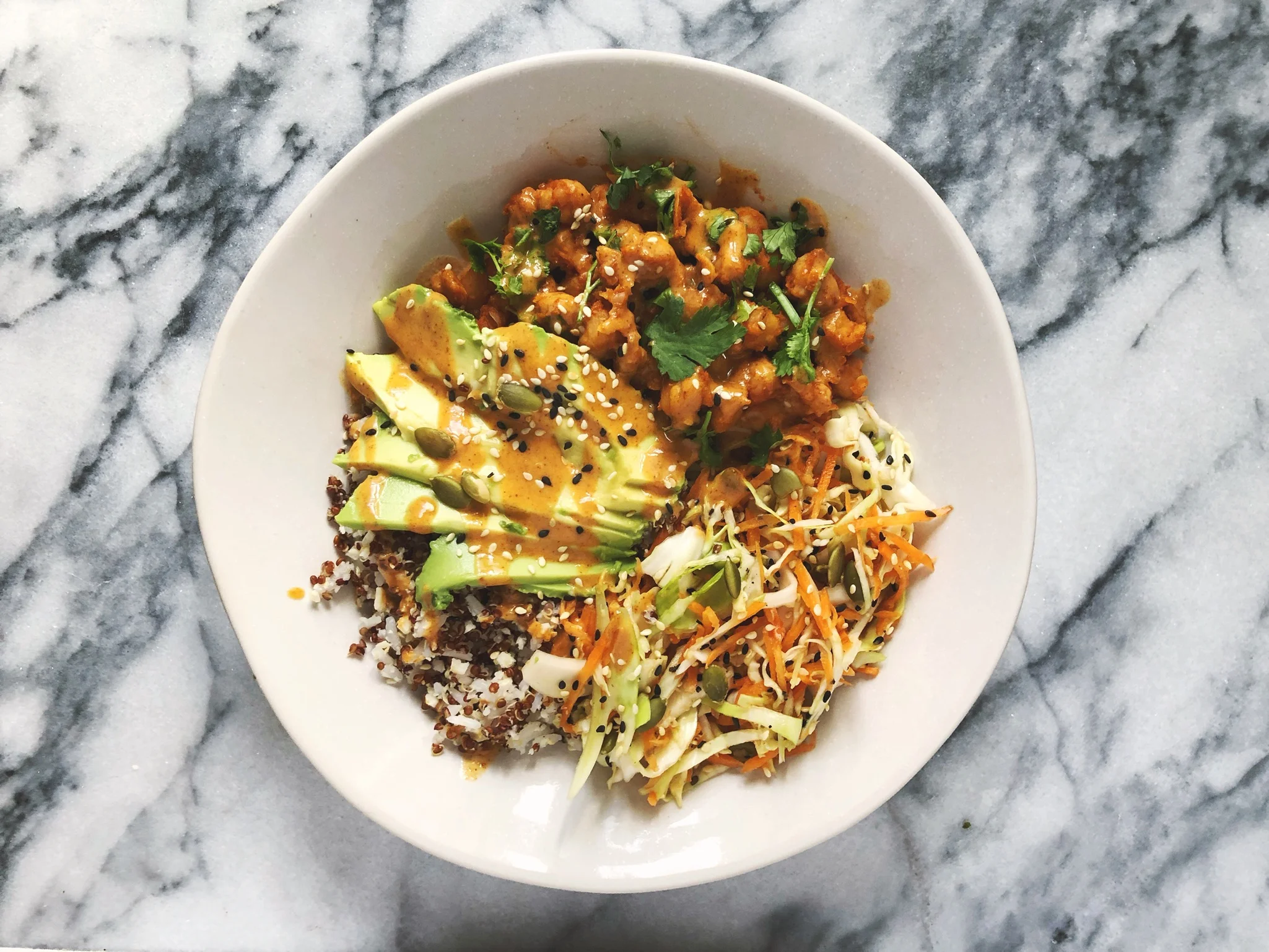 One of my favorite things to make for lunch are grain bowls. I love having a variety of colors, textures, and flavors all compiled into one meal. Not only that, but the components are easily switched in and out for other items. I'm not a huge fan of meal prep or eating the same thing every day all week, but if even two out of 4 items are swapped, it can taste like a whole new dish to me. Here are two of my favorite standby recipes: a carrot cabbage slaw and a miso chipotle sauce. I paired them with a quinoa/rice blend, curry chickpeas, and avocado.